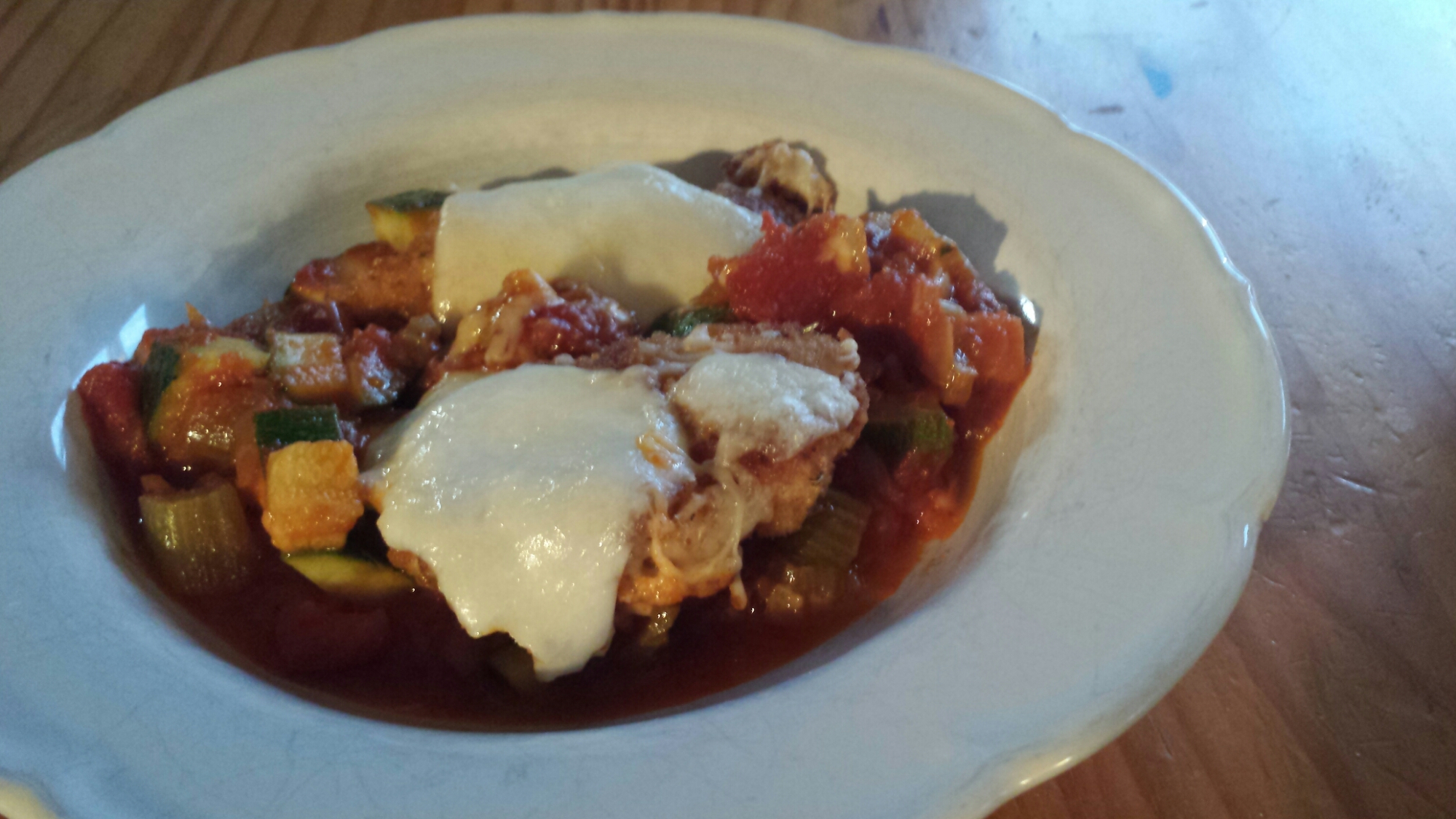 345 gram kipfilethaasjes, 1 groot ei, 1 ruime kop paneermeel, 20 gram parmezaanse kaas, 1 bol mozzarella, 1 blikje tomaten passata (of pizza/pasta saus), 1 ui, 2 tenen knoflook, 1 bleekselderij, 1 courgette, boter