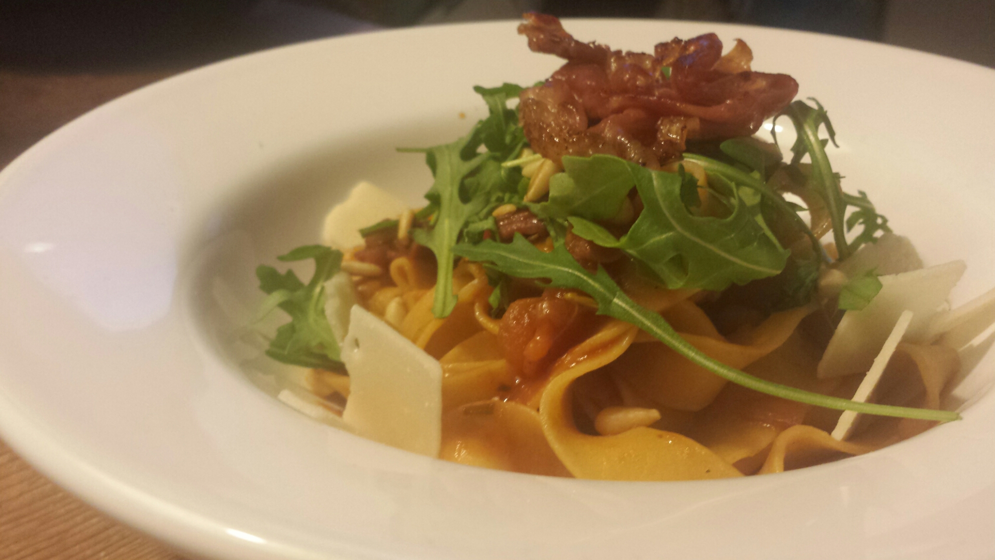 Een paar nestjes parpadelle, een klontje boter, 3 sjalotten, 2 (grote) tenen knoflook, 1 grote handvol cherry tomaten, 4 takjes rozemarijn, 1 blik gepelde tomaten, een eetlepel in stukjes gesneden zongedroogde tomaten, 1 scheut rode wijn azijn, peper en zout, een paar plakjes parmaham, parmezaanse kaas, pijnboompitten en wat rucola.