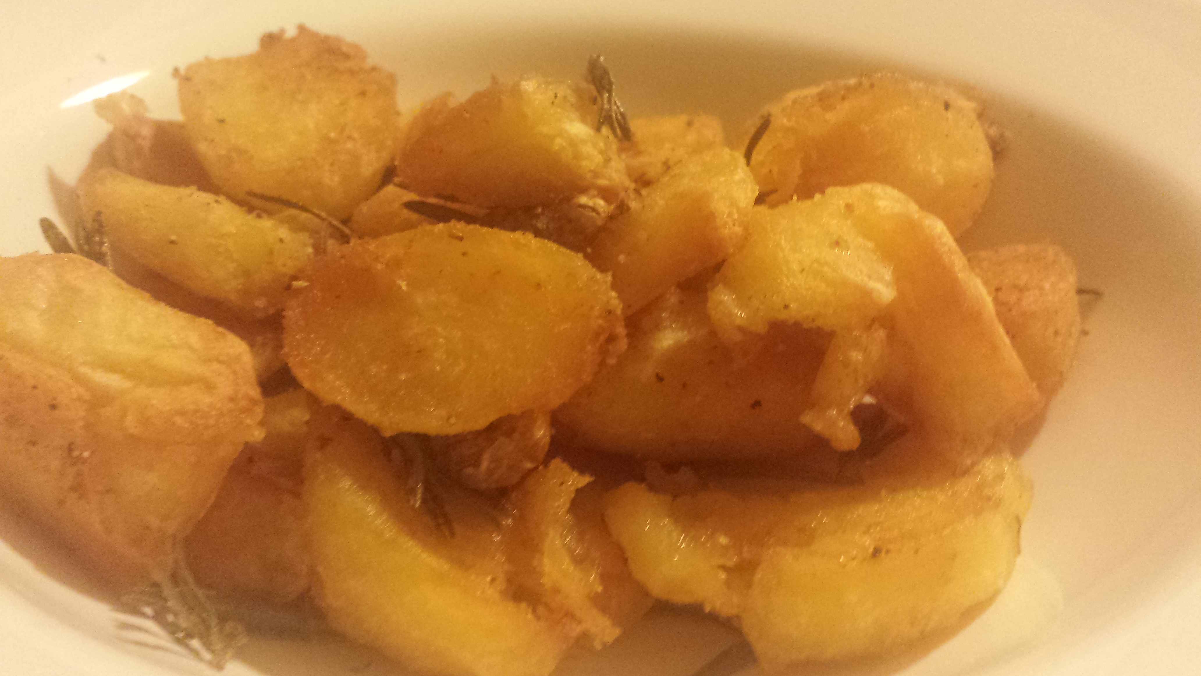 Begin met het schillen van de aardappels. Spoel ze nog een keer om en snijd ze in iets kleinere stukken. Ik snijd ze meestal ‘iets groter dan hapklaar’, als je daar iets aan hebt? Breng gezouten water aan de kook en kook je aardappeltjes voor 10 minuten. Giet ze af in een vergiet en hussel ze een beetje rond, zodat ze een beetje korrelig worden aan de randjes. Doe 1 eetlepel olijfolie en de boter in een ovenschaal en verdeel de aardappeltjes erin. Het is belangrijk dat je maar 1 laag aardappeltjes hebt, als je gaat stapelen worden ze niet lekker knapperig. Zet ze een half uurtje in een op 190 graden voorverwarmde oven. Na een half uurtje is het tijd om de kruiden toe te voegen. Rits de rozemarijnblaadjes van de takjes en hussel ze met de tenen knoflook, de olijfolie en de peper en zout door elkaar. Voordat je de kruiden over de aardappeltjes verdeeld kun je met een aardappelstamper voorzichtig een beetje druk uitoefenen op de aardappeltjes. Op die manier hebben ze relatief meer contact met je ovenschaal waardoor ze, je raad het al, knapperiger worden. Verdeel dan vervolgens je kruidenmengsel een beetje over de aardappeltjes en schuif deze voor nog zo’n 25 tot 30 minuutjes terug. Of totdat ze een goudbruin en krokant zijn!