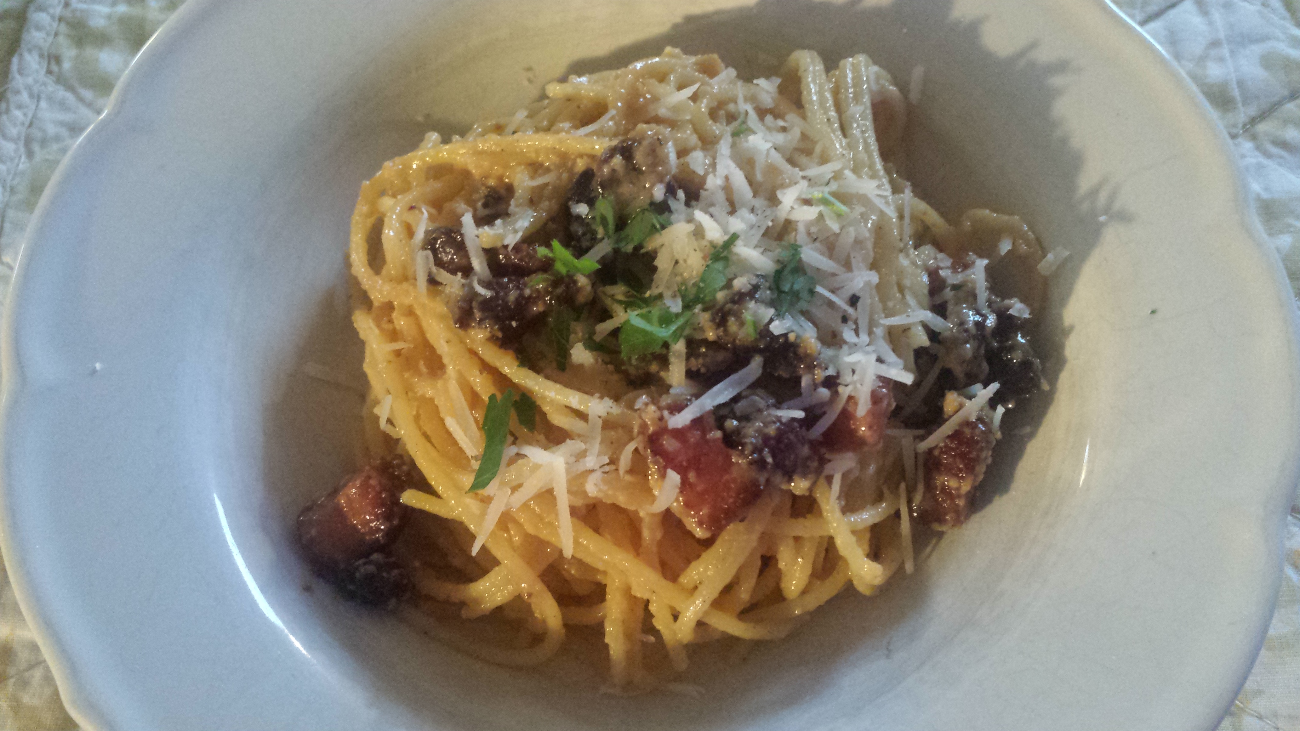 Wist je trouwens waar de naam spaghetti carbonara vandaan komt? Het gerecht komt oorspronkelijk van de ‘arme’ kolenbranders uit Lazio (de streek waar Rome ligt) die tijdens hun pauzes deze pasta aten. Daarom ook dat de ingrediënten die gebruikt zijn allemaal zogenaamde ‘arme’ ingrediënten zijn. In ieder geval, die kolenbranders heten in het Italiaans carbonari derhalve dus de naam pasta carbonara: pasta van de kolenbranders. Deze keer heb ik ‘gewoon’ gerookt ontbijtspek gebruikt. Zo een in een blok, dat je zelf kan kiezen of je blokjes, reepjes, rondjes, hartjes, sterretjes of weet ik veel wat voor vormen snijd. Je kan er ook voor kiezen naar de slager te gaan en te vragen voor pancetta, of als je het echt goed wil doen, voor varkenswang (Guanciale).