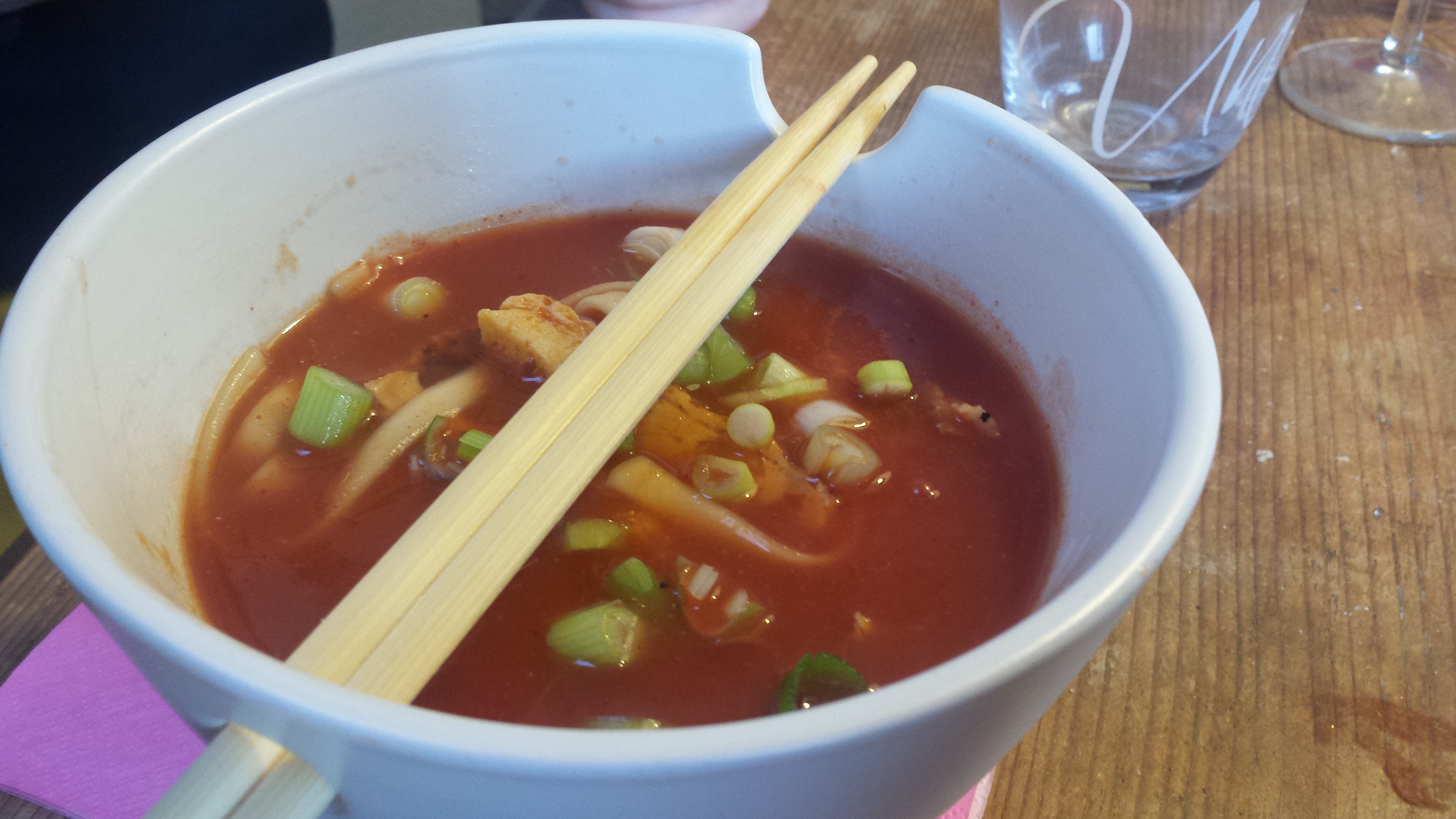 Een tip van mij: het is erg handig als je de noodles in wat kleinere stukjes snijd/knipt voor je hem door de soep roert. De lange slierten maken het namelijk erg moeilijk om op te scheppen en om charmant te eten!