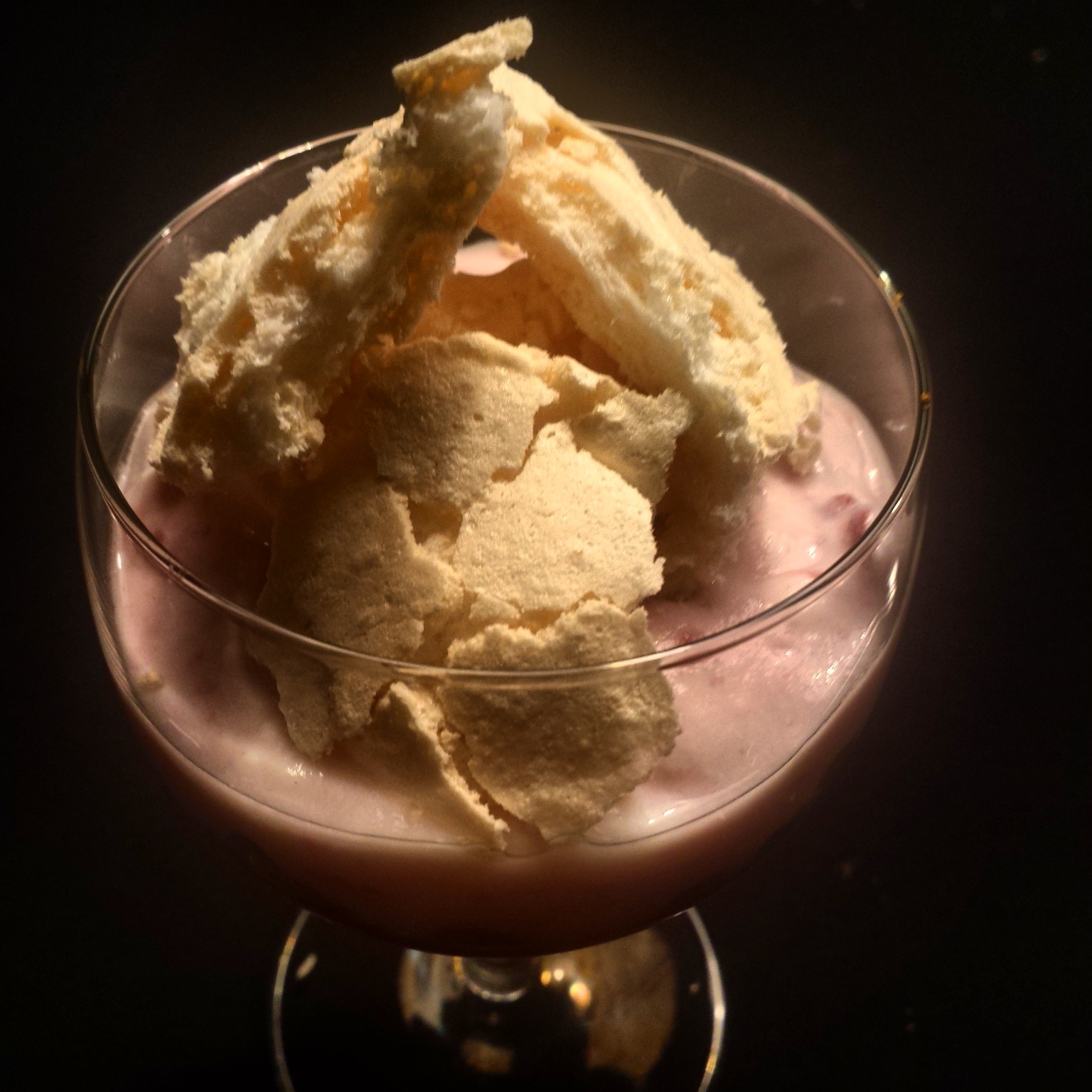 Makkelijker kan bijna niet, dus het helpt als je het in een mooi glas serveert. Ik koos zelf voor wijnglazen. Begin met het verkruimelen van de Bastogne koeken. Het is een beetje afhankelijk van hoe groot de glazen zijn die je gebruikt, hoe veel je er nodig hebt. Maar als je wat Bastogne kruimels over hebt kun je ze versieren, en als blijkt dat je te weinig kruimels hebt, kun je er altijd wat bij kruimelen. Ik had zelf 6 en een half koekje nodig. Roer zoveel jam door de yoghurt als je lekker vindt. Ik zou zeggen niet te veel, want dan wordt het te zoet. Als je beide componenten klaar hebt, kun je je toetje gaan bouwen. Doe dit door laagjes Bastogne en yoghurt af te wisselen. Ik zou zelf niet te dunne laagjes maken, want dan proef je het verschil niet meer. Eindig met de yoghurt en dan kun je het of zo serveren, of je kunt er Bastogne kruimels over strooien, of een heel bastognekoekje erin steken, of iets met poedersuiker ofzo, laat je verbeelding erop los zou ik zeggen! Ik koos ervoor om merengue en die in gebroken stukken erop te leggen.