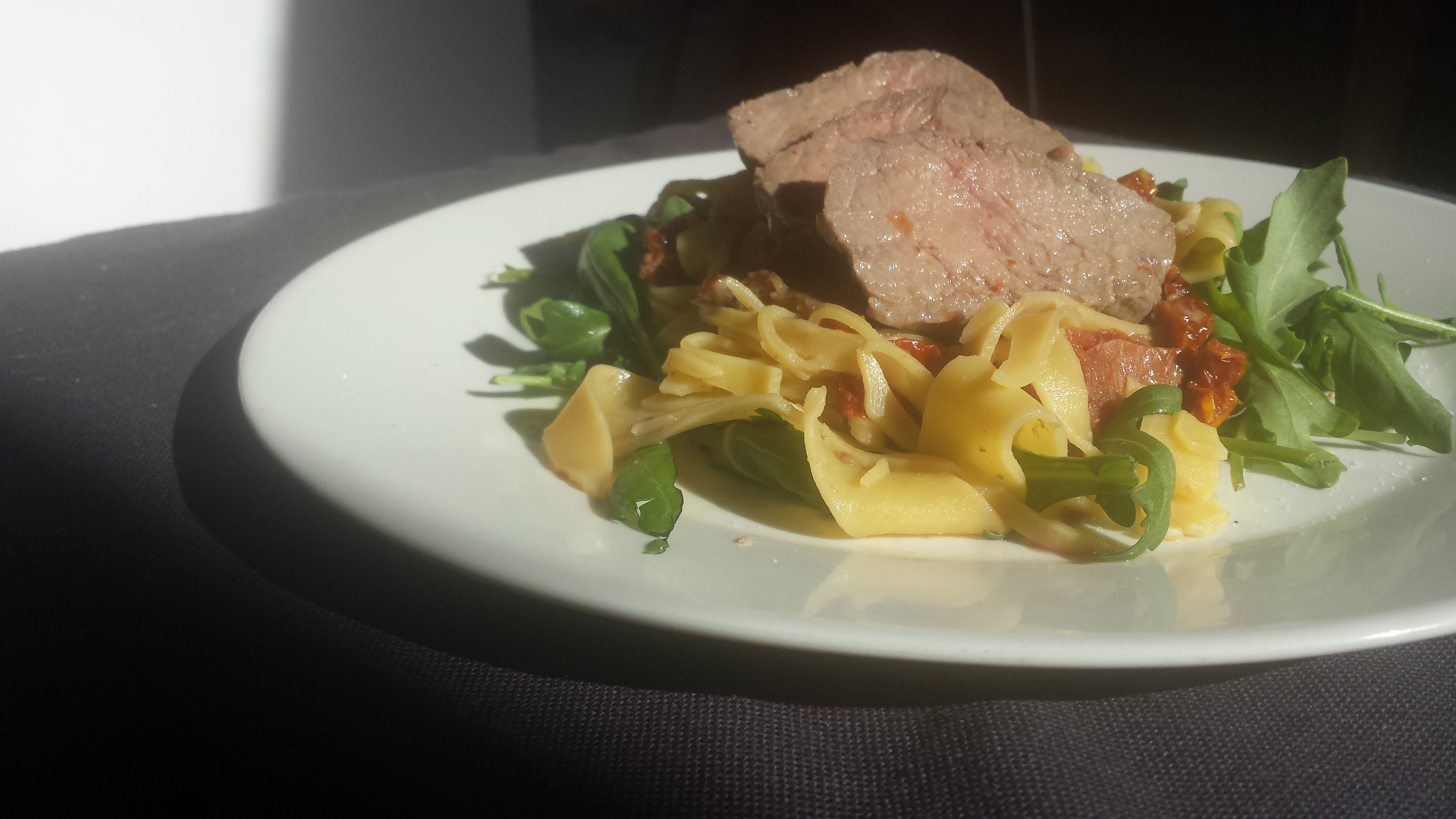 Breng de bouillon samen met de slagroom aan de kook met flink wat peper en zout, zodat het erg hoog op smaak is. Snijd de zongedroogde tomaatjes in stukjes en voeg deze toe aan het room/bouillon mengsel. Leg hier vervolgens je kalfsoester voor zo’n 6 minuutjes in en draai hem halverwege om. Zorg ervoor dat hij helemaal bedekt is in het vocht, anders kun je het een beetje aanvullen met bouillon en room tot hij wel onder staat. Zet ondertussen alvast wat water op om de pasta in te koken. Als de kalfsoester 6 minuutjes heeft gegaard haal je hem uit het vocht en laat je hem voor 15 minuutjes rusten in aluminiumfolie. In die tijd voeg je een scheutje wijn toe aan het roomsausje en laat je dat inkoken ook kook je in deze tijd de pasta. Als de pasta gaar is, giet je hem af en laat je hem nog heel even mee pruttelen in de ingekookte roomsaus. Maak je bord op door er wat rucola op te leggen die je ligt besprenkeld met olijfolie, peper en zout. Leg hier wat van de pasta op. Snijd de kalfsoester in plakjes en leg die op de pasta. Besprenkel het geheel eventueel met nog een lepeltje saus.