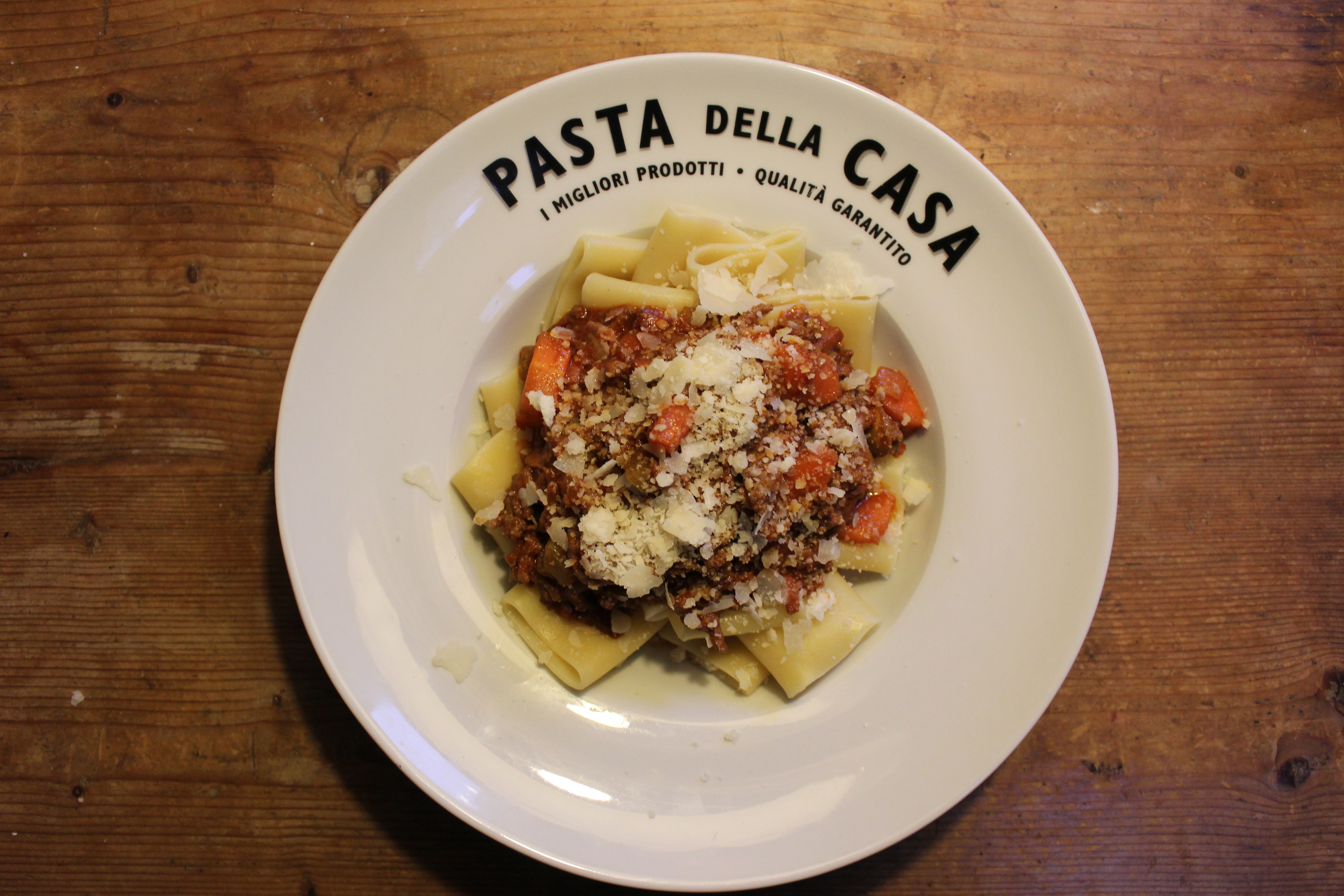 Een dingetje wat ik jullie wel nog op het hart wil drukken is dat je bolognese idealiter niet met spaghetti eet. Dit heeft een vrij simpele reden: doordat de saus vrij ‘chunky’ is, kan je de saus beter combineren met een pasta waar de saus lekker ‘in’ kan gaan zitten. Denk hierbij aan parpadelle, tagliatelle maar ook bijvoorbeeld aan rigatoni. Ik koos in dit geval voor een pasta die papa en mama voor mij hebben meegenomen uit Rome.