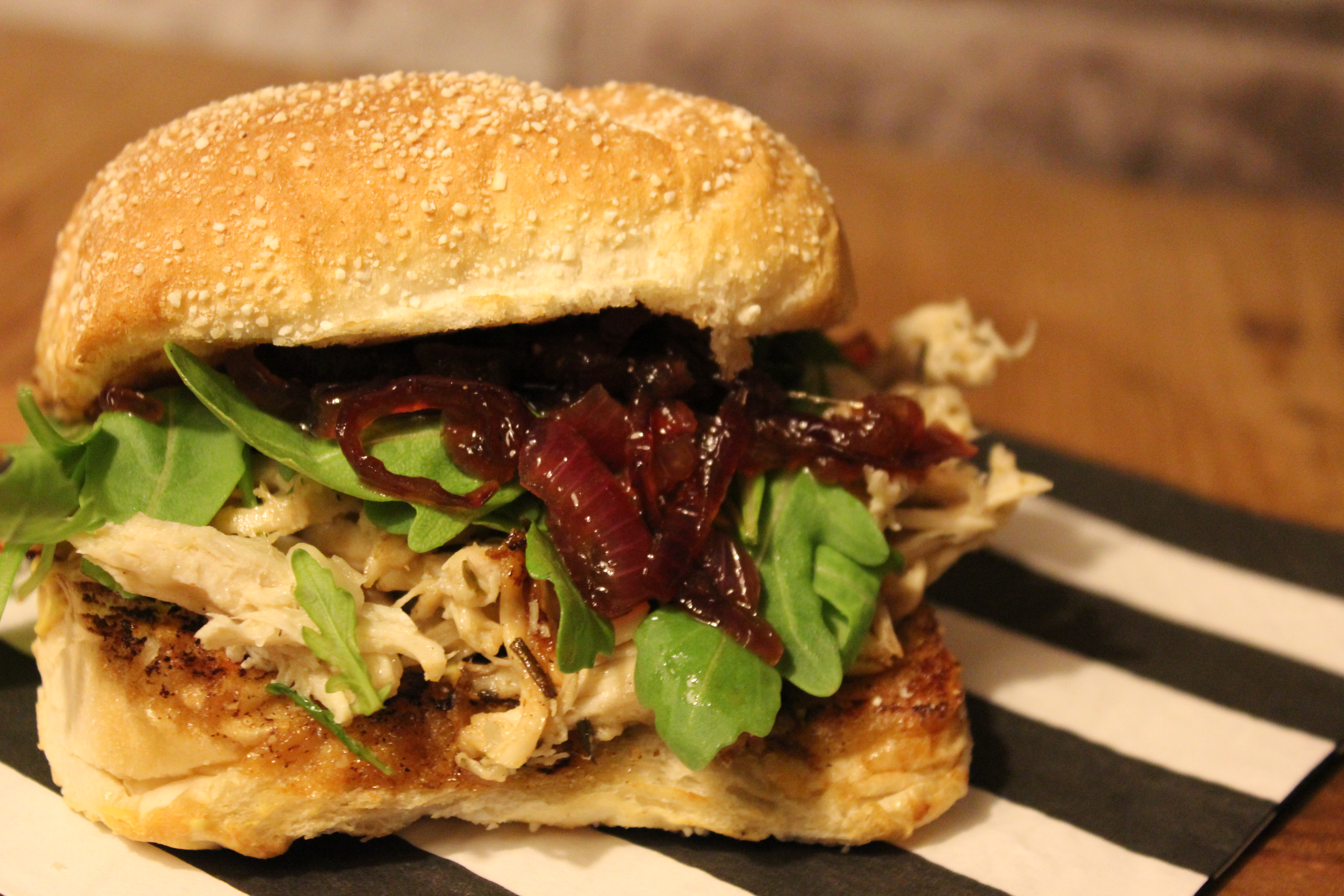 - Smeer wat mosterd uit op het onderste deel van het broodje en smeer wat van de uienchutney op het bovenste deel van het broodje. Leg hier vervolgens wat van de pulled chicken op, gevolgd door een handje rucola. En vervolgens natuurlijk weer de bovenkant van het broodje.