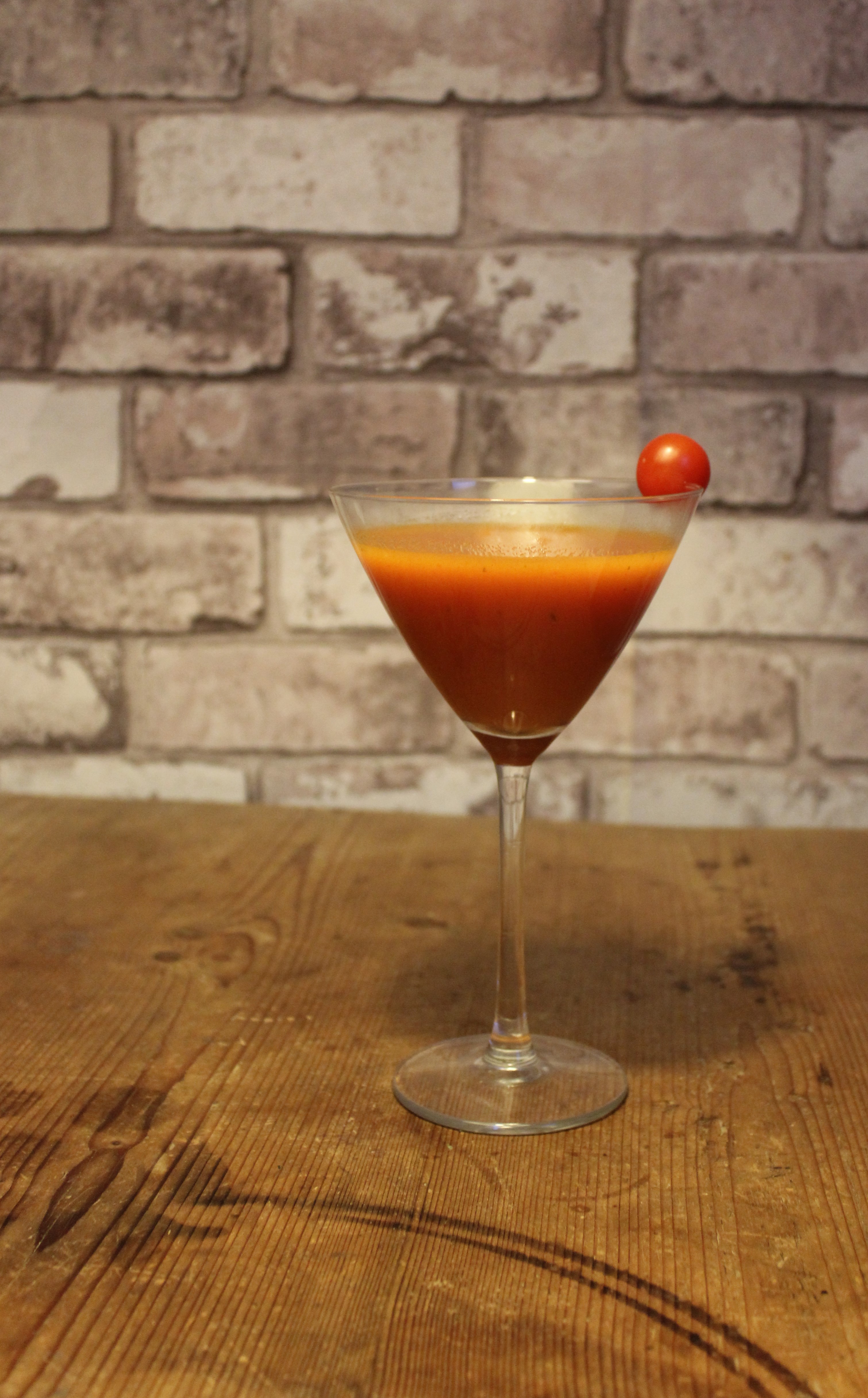 - Zeef de bouillon en serveer de bouillon in een klein glaasje. Ik heb geen kleine glaasjes maar wel martini glazen, dus deed ik daar mijn bouillon in. Bovendien garneerde ik mijn glas met een tomaatje. Ik bedenk me nu dat ik eigenlijk drie tomaatjes of olijfjes op een prikkertje had moeten doen om het martini gevoel helemaal compleet te maken, maar dat is dan iets voor de volgende keer 😉