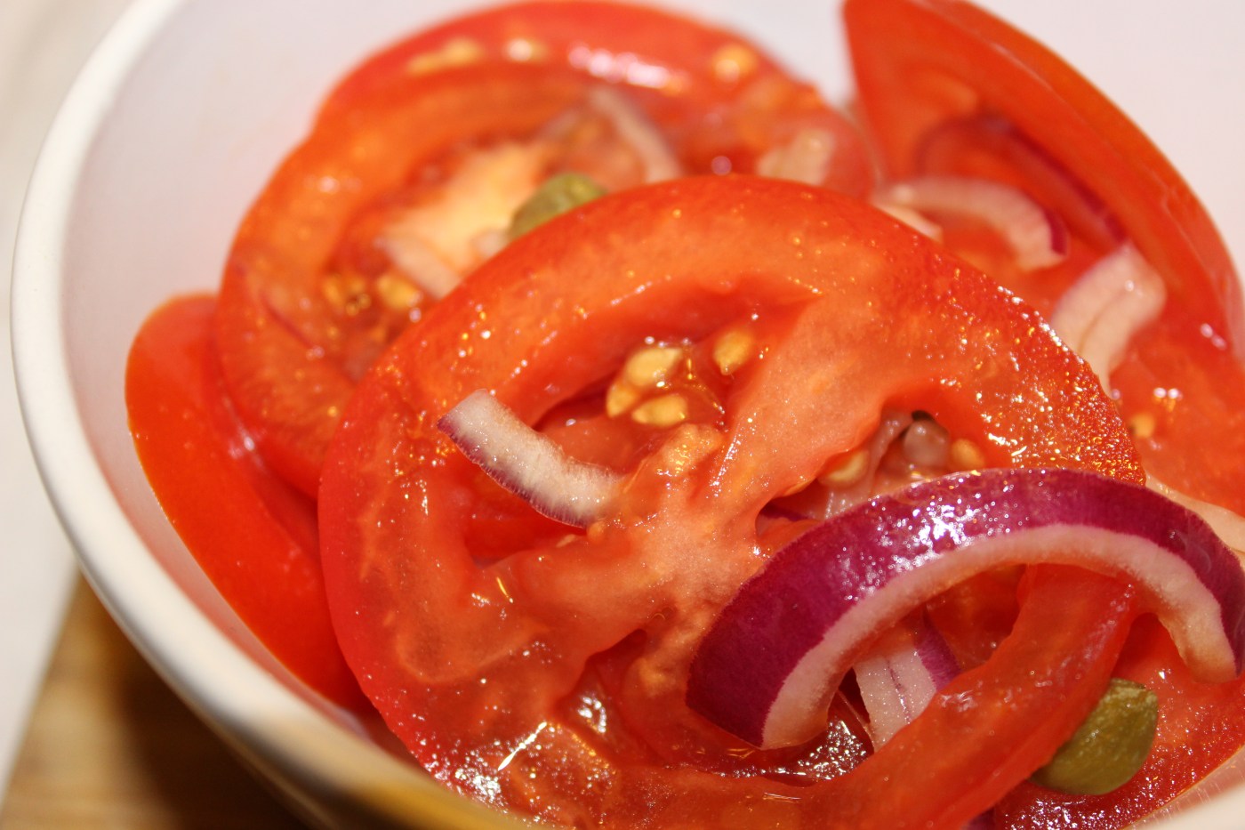 5. Maak in de tussentijd de salade. Snijd hiervoor de tomaten in plakken, snijd het sjalotje in dunne halve ringen en doe de tomaat en de sjalot in een bak met de kappertjes. Maak een snelle vinaigrette van de olie en de balsamico en breng deze op smaak met peper en zout. Je kan nu twee dingen doen, of de vinaigrette apart houden en hem aan tafel over de salade gieten, of je giet hem er nu al door, zodat de smaken in kunnen trekken. Als je de vinaigrette er direct al overheen gooit wordt de salade wel minder mooi, maar hij smaakt wel lekkerder, het is net even wat je zelf het belangrijkste vindt.