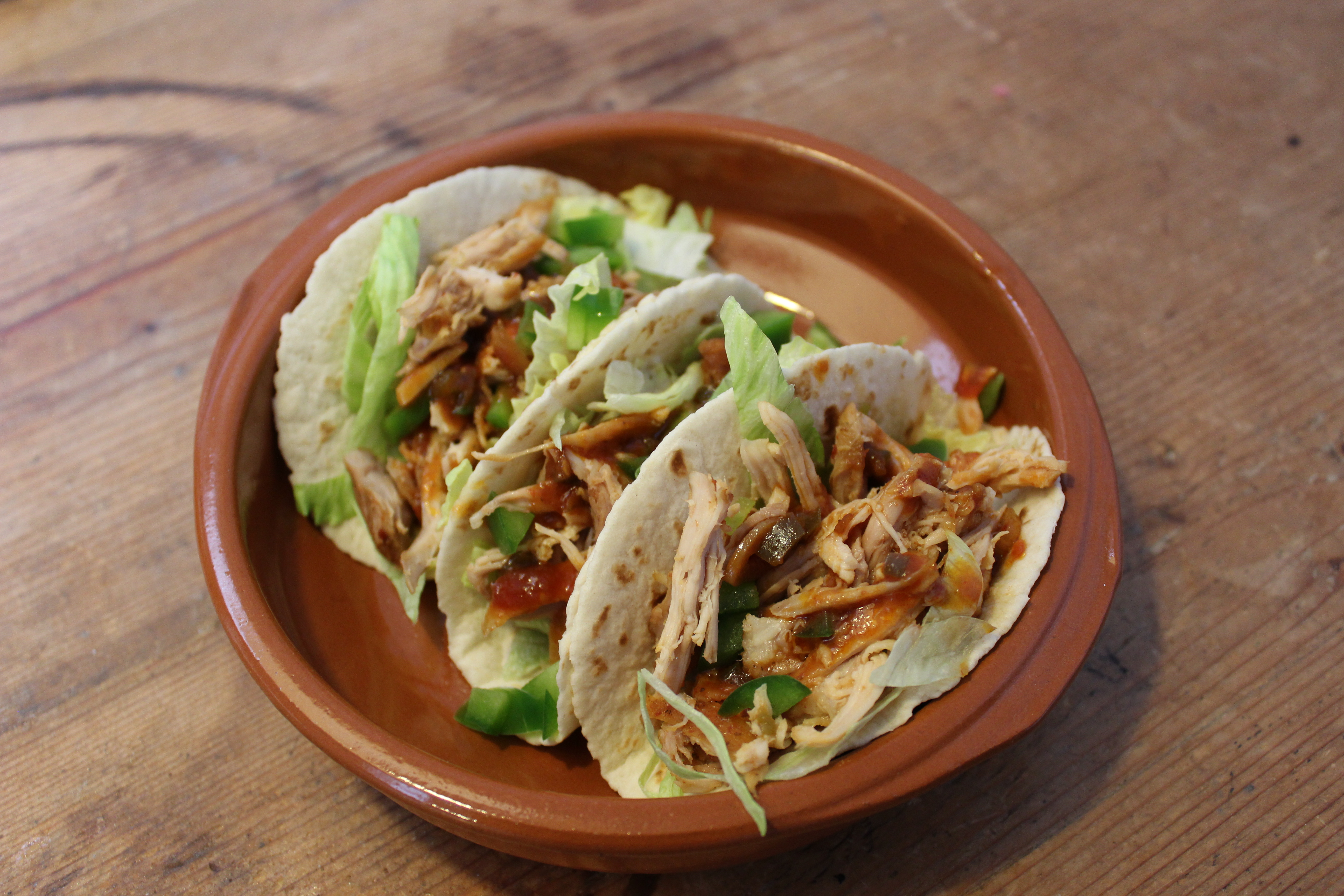 Ik serveerde dit keer de pulled chicken in mini tortilla’s die ik als taco’s gebruikte (echte mexicaanse taco’s zijn zacht, niet hard) en 3 taco’s was voor mij ruim voldoende als maaltijd. Ik deed er wat sla bij en had de paprika, komkommer en tomaatjes erbij geserveerd.