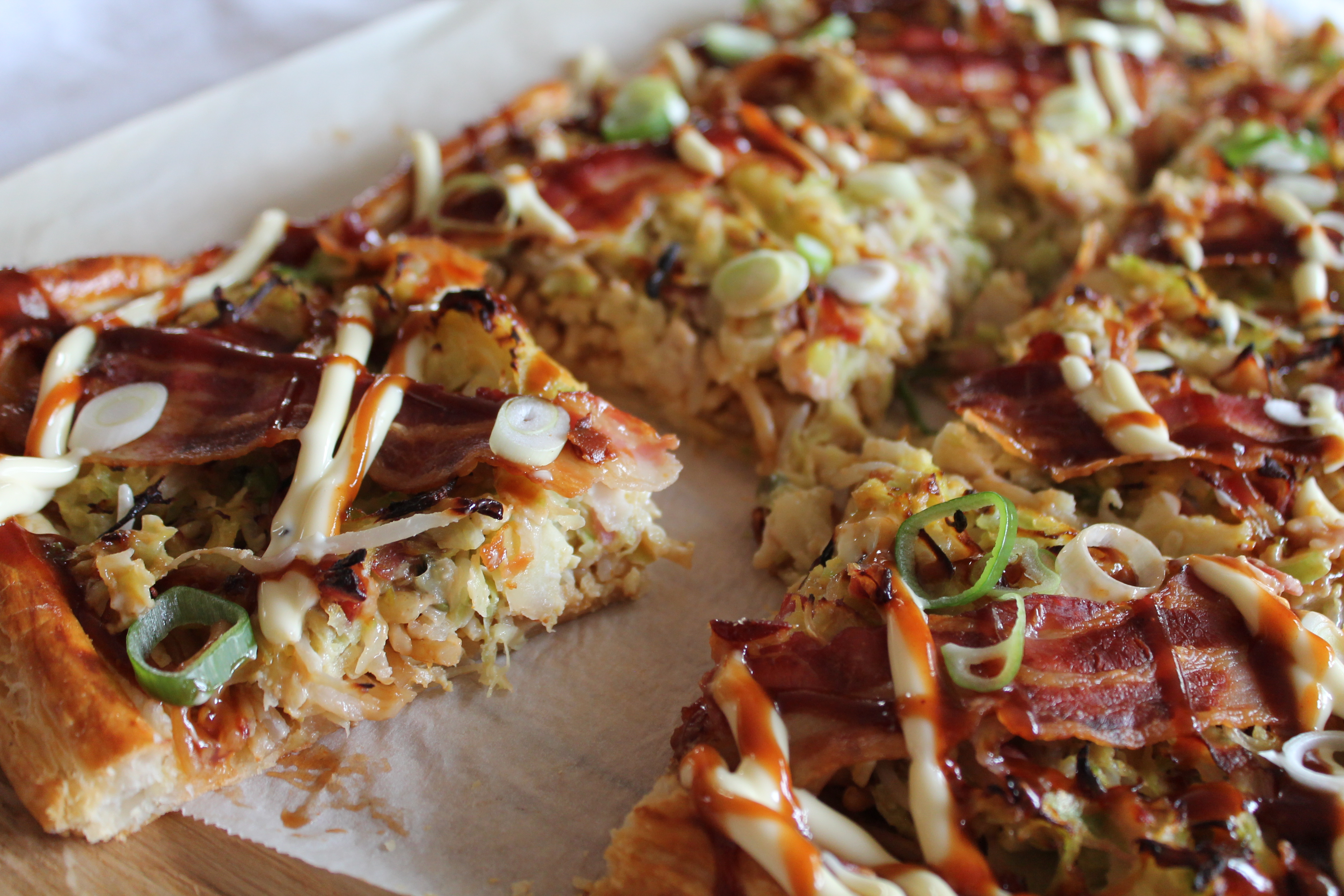 Ik pakte de ingrediënten die ik typerend vind voor de hiroshima-style okonomiyaki (spitskool, varkensvlees, noodles en ei) en verwerkte die in een plaattaart.