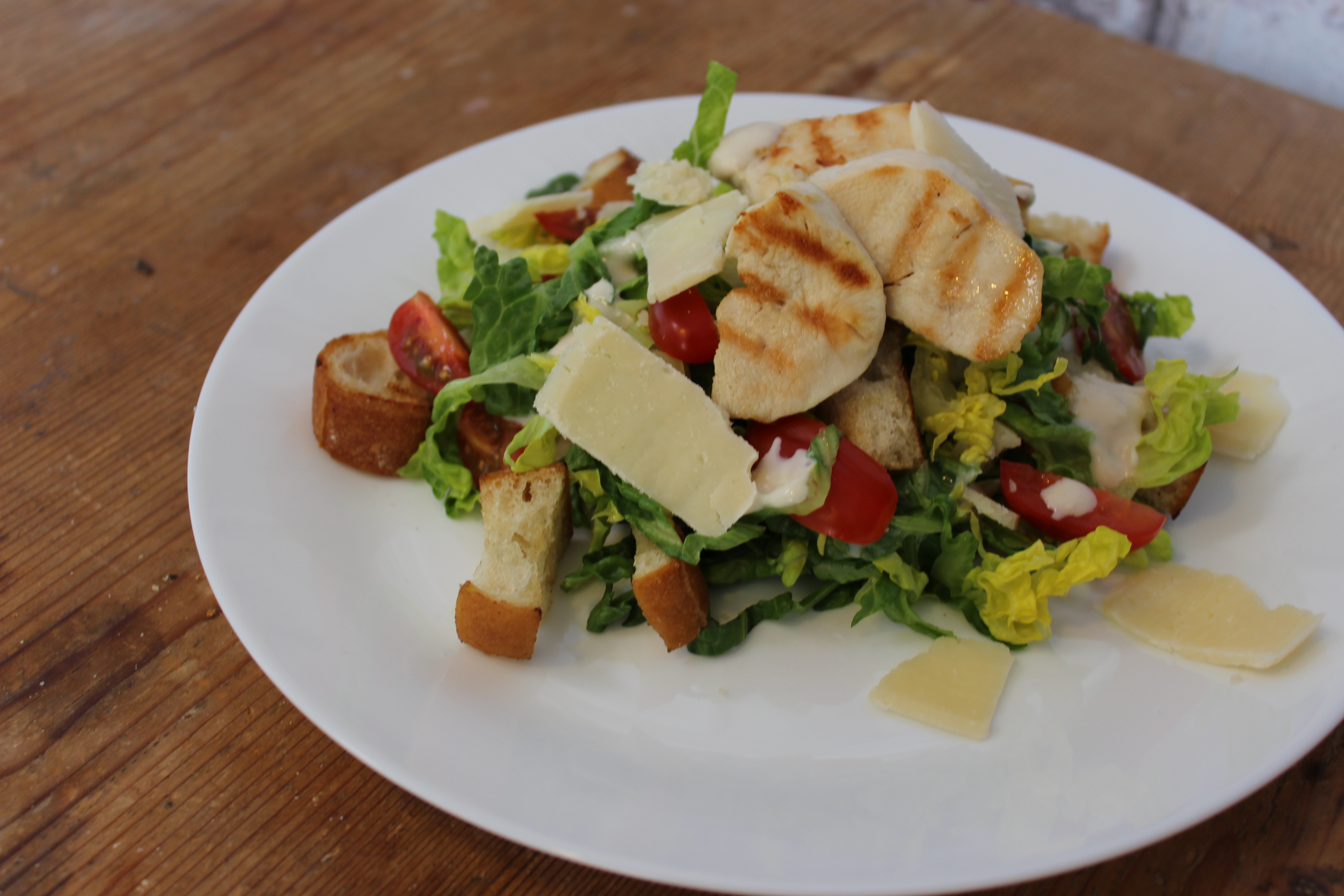 - Doe de salade op een bord en strooi er wat croutons over. Verdeel wat van de dressing over de salade en leg je kipstukjes erop. Rasp tot slot nog wat Parmezaanse kaas over het bord en klaar is je zelfgemaakte meesterwerk.