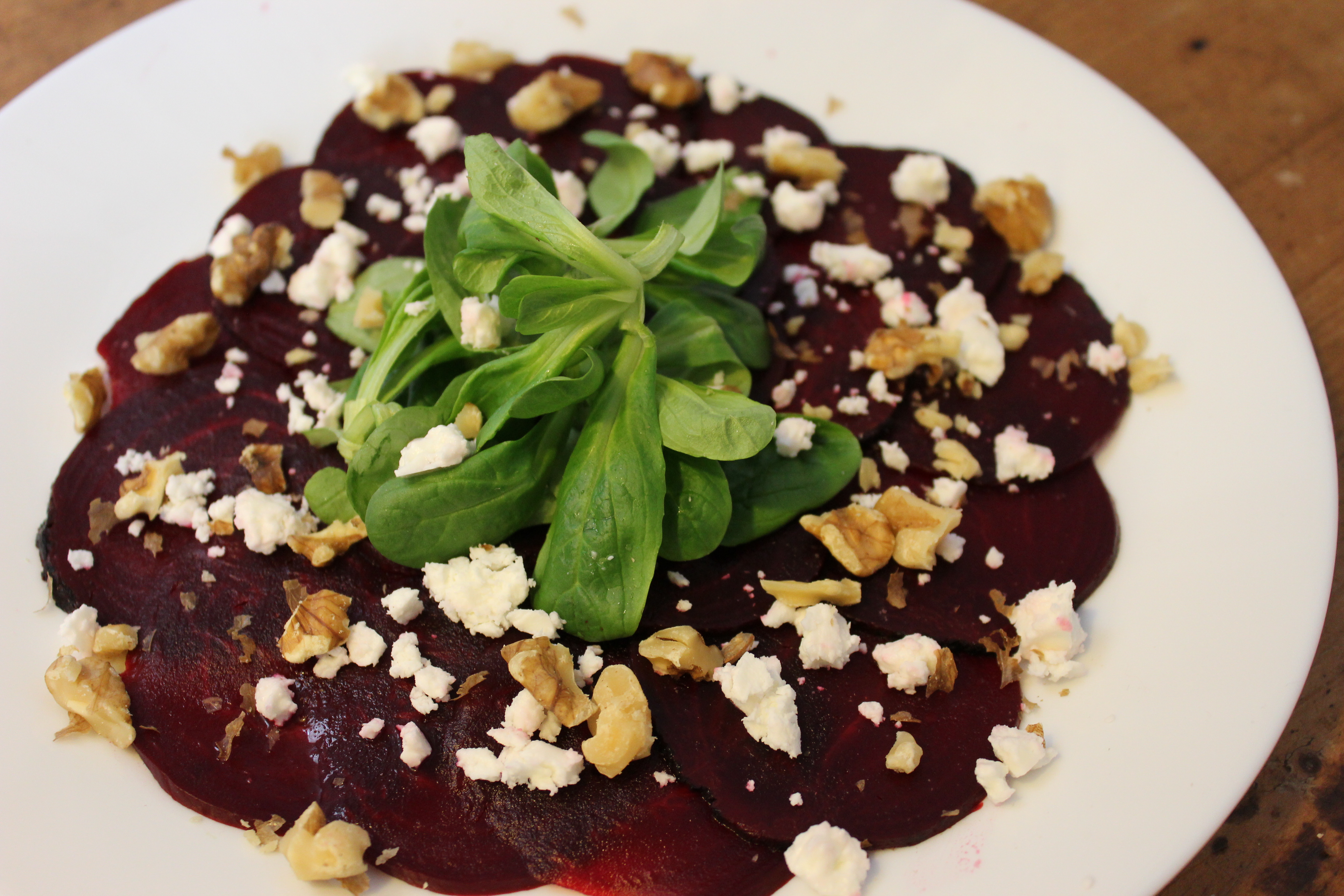 Omdat ik geen zin had om uren in de keuken te staan besloot ik voor iets simpels te gaan en besloot ik bieten carpaccio te maken. Eigenlijk had ik een vegan-variant willen maken, met een mierikswortelroom, maar omdat ik geen mierikswortel(puree) kon vinden, besloot ik te settelen voor een versie met kaas. Wat ik, als cheese lover, ook absoluut niet erg vond š